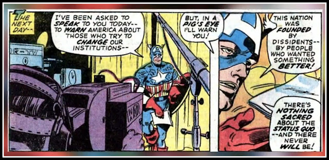 עכשיו הוא חי בעידן וייטנאם, מלחמה שהציבור לא רצה והוא נאלץ לבצע בחירה, האם הוא, כקפטן אמריקה, אמור לעמוד לצד המשמר הלאומי בהוראה שניתנה לו על ידי נשיא ארצות הברית או שהוא אמור לסמל ולהיות משהו אחר, משהו גדול יותר מזה עבור המפגינים בעד השלום? (דוגמת ההפגנה באוניברסיטת קנט)