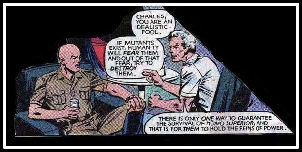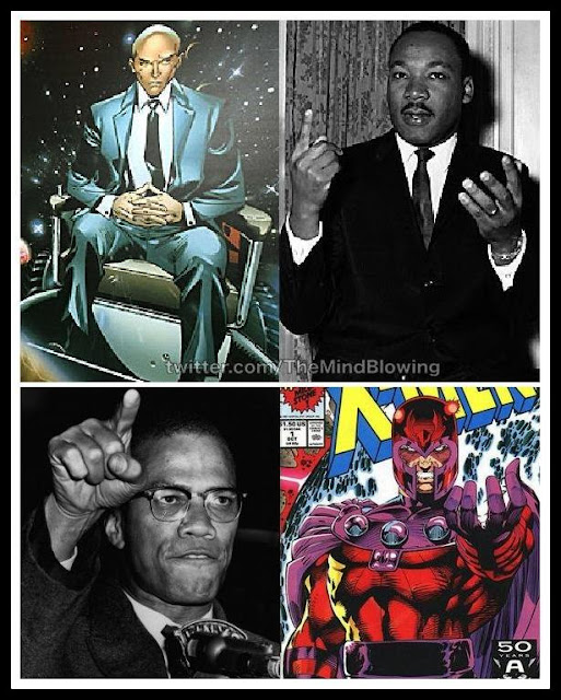 שיחד הם יכולים בקלות לשלוט בכדור הארץ אבל עומדים משני צדדי מתרס במשך עשרות שנים מקבילים באופן ברור וחד משמעי ללותר קינג ואקס: פרופסור אקס מאמין בשיתוף פעולה עם הלא-מוטנטים לקראת בניית הבנה טובה יותר בין שתי הקהילות. מגנטו רוצה להילחם בהם. כיהודי, ניצול השואה, יש בו את האמונה הקנאית שבני אדם יעשו הכל כדי ללכוד, לנצל ולהרוג מוטנטים.
