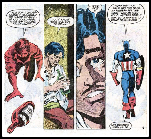 חלק מהסיפורים המפורסמים יותר בתקופת הברונזה משקפים את יחס ההתפכחות של פעם. במקרה של טוני סטארק, ההתפכחות הייתה מילולית."השד בבקבוק" מ1979 מגולל עלילה בה איש הברזל, טוני סטארק, נאבק באלכוהוליזם שלו וסופג ביקורת מחבריו הגיבורים (קפטן אמריקה כמובן)